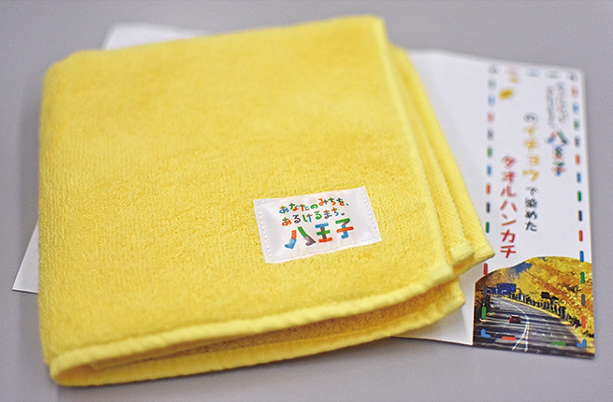 八王子市の木・イチョウで染めたタオルハンカチが新たな名産品になるかもしれない――。バスケB3・東京八王子ビートレインズが八王子観光PR特使として、新商品を開発。八王子のイチョウを使って染めたタオルハンカチを5月1日から「道の駅 八王子滝山」で販売している。副駅長の須田巧さんは「道の駅も、タオルもたくさんの人に知ってもらえれば」と話す。