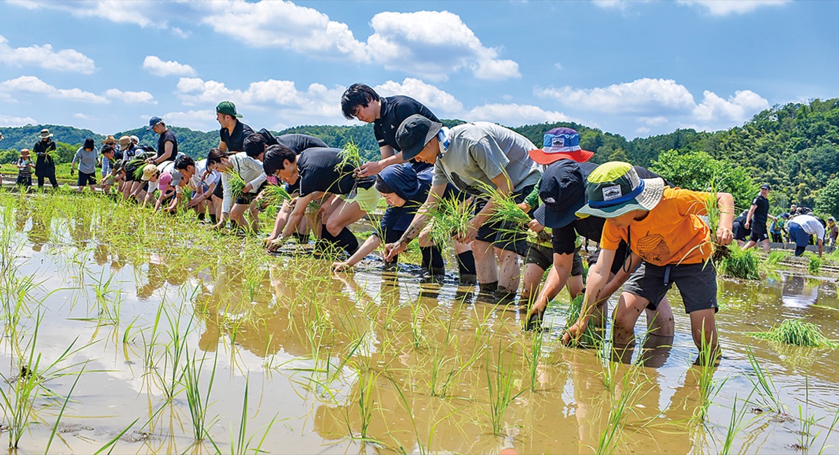 NPO法人はちぷろが6月8日、恒例の田植え体験イベントを行った=写真。高月町の田んぼ8畝の広さに約150人が参加。足袋に履き替え泥の中をゆっくりと移動。途中、尻もちをつき泥だらけになりながらも、息を合わせて1列ずつ酒米品種「ひとごこち」の苗を植えた。この米は秋に収穫し12〜1月頃に発売される日本酒「高尾の天狗」などに醸造される。