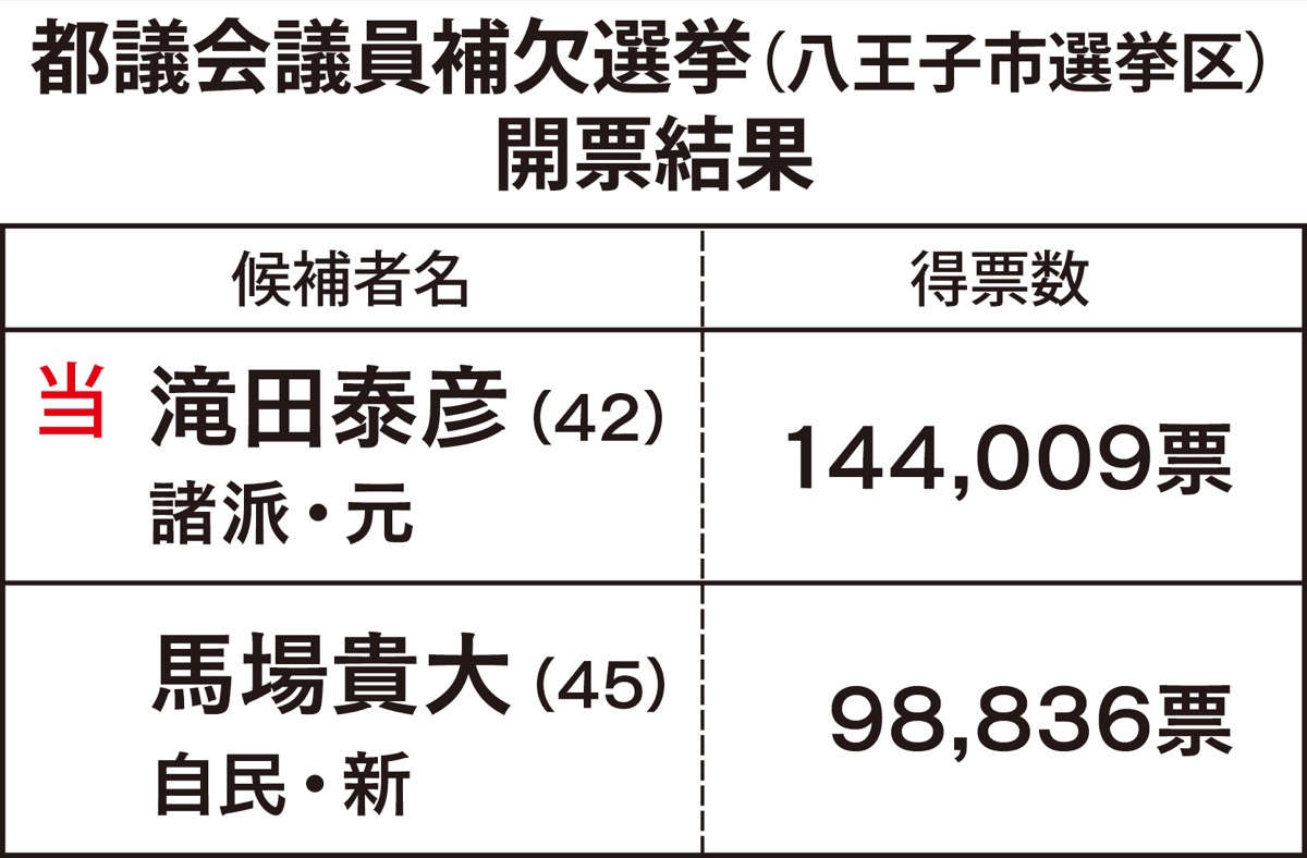 東京都議会議員補欠選挙の八王子市選挙区(欠員1)が7月7日に投開票され、諸派元職の滝田泰彦氏(42)が14万4009票を獲得して当選した。自民新人の馬場貴大氏(45)との一騎打ちを制して、3年ぶりに都政への返り咲きを果たした。投票率は55・67%。