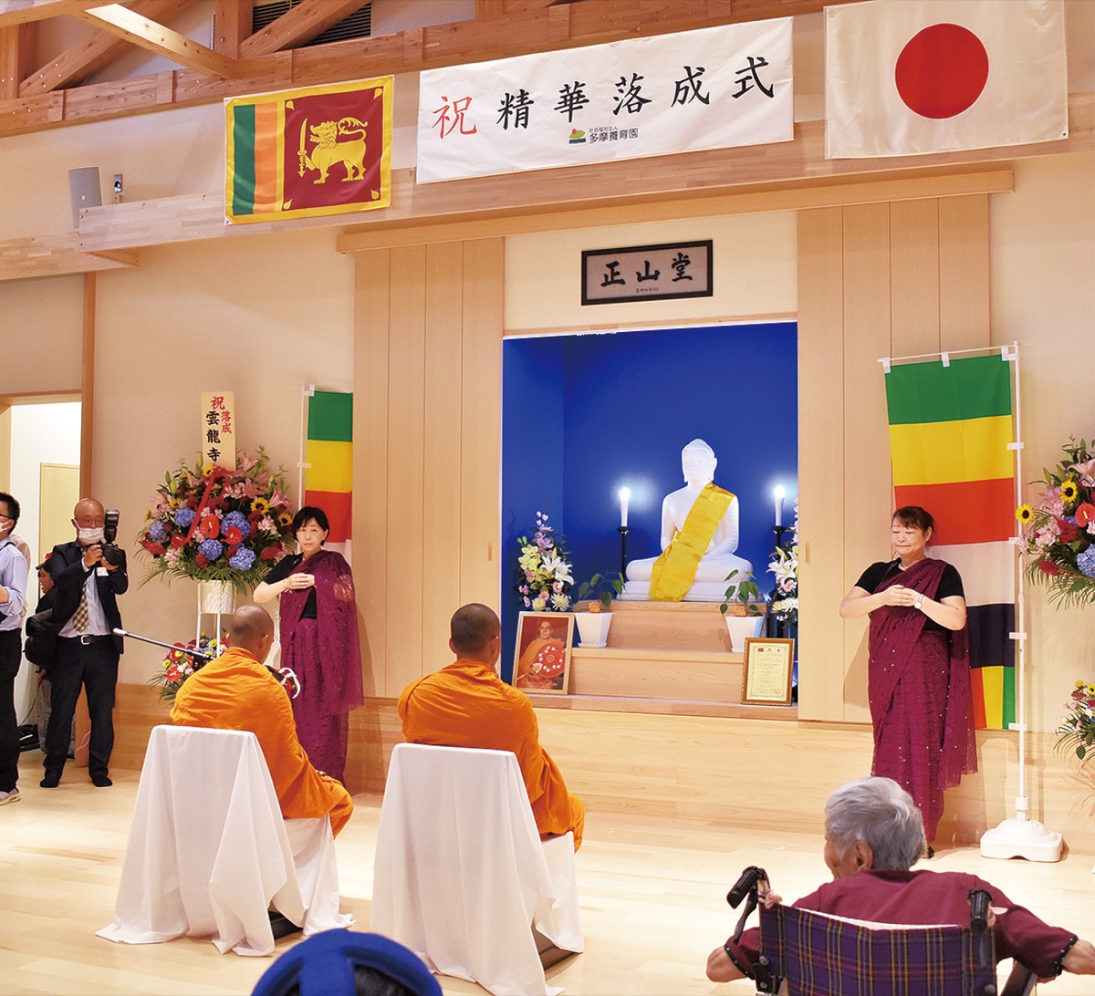 式典では、同法人と縁の深いスリランカの大僧正から寄贈された仏像「ダンミッサラ仏」=写真中央=がお披露目され、釈迦牟尼国際佛教センター館長のピアダッシ師による入仏開眼法要が行われた。