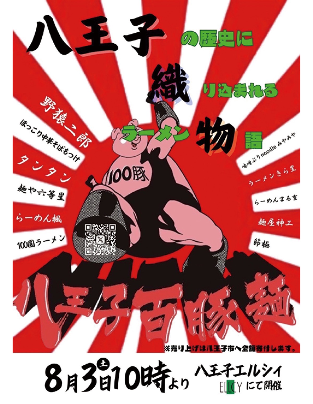 「八王子をラーメンで盛り上げたい」という思いから、10を超えるラーメン店が集まり、この日のためにオリジナルラーメンを製作。「チェリーポーク」を使用し、自家製麺に八王子らしく玉ねぎもトッピング。化学調味料を使わず「八王子百豚」を完成させた。1杯1000円。売り上げは運営のための経費を除いて市内の社会福祉団体に寄付する。