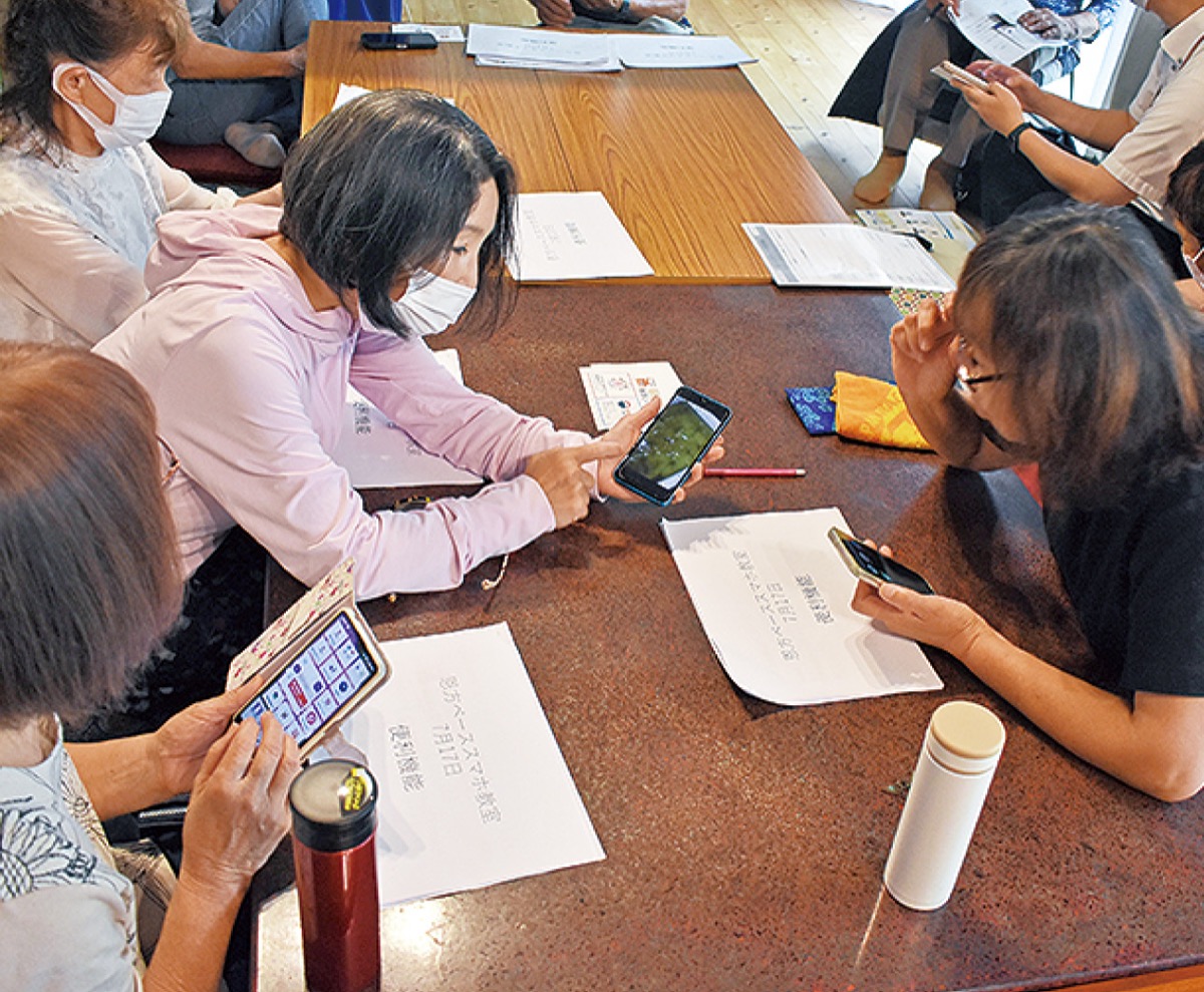 「ベースにはいつも誰かが来て何かやってるな、というイメージにしたい」と話すのは副会長の山本喜紀さん(60)。7月17日にはスマホ教室が行われ、市が導入している健康増進アプリ「てくポ」の使い方などを8人ほどで学んだ=写真下。参加した小川康子さん(61)は「お店に行くより気軽でいい。その場で質問しやすい」と話し、山本紀子さん(56)は「恩方でやってくれるのは助かる」と満足気。