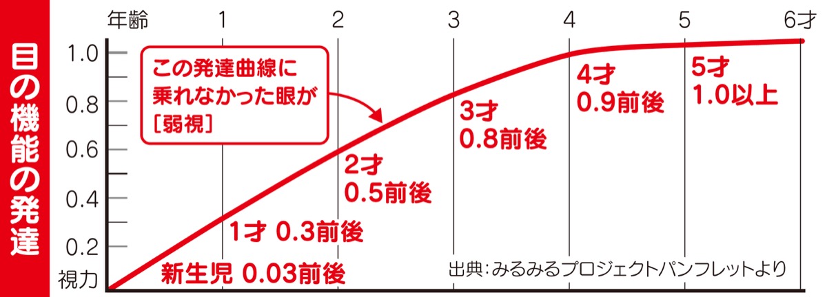 一般的に、子どもの視力は新生児から5才までの間に徐々に上がり始め、6〜8才ごろにほぼ完成すると言われている。生まれたばかりでは0・02〜0・04くらいの視力で、3才で0・8前後、4才で0・9前後、5才で1・0以上あることが目の機能の平均的な発達で、この発達から逸脱していると「弱視」と診断される。ただし、視力が完成する前に発見し、専用のメガネをかけるなどの矯正治療を行うことで平均的な発達を促すことができるという。
