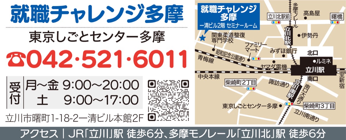 事業責任者の山口さんによれば「未経験でも企業実習で仕事に対する姿勢を評価され、就職につながるケースも少なくない。担当のカウンセラーが寄り添って支援してくれるのでとても心強いとの声も多いです」と話す。事業副責任者の吉野さんは「多摩地域の特色でもある製造業をはじめ、IT企業など多様な業種にご利用いただいています。人材確保につながると事業登録いただく企業も増えています」。一歩踏み出したい人は二次元コード、もしくは電話で問合せを。
