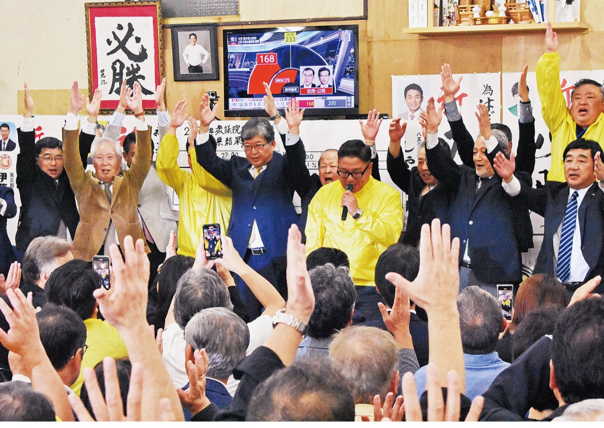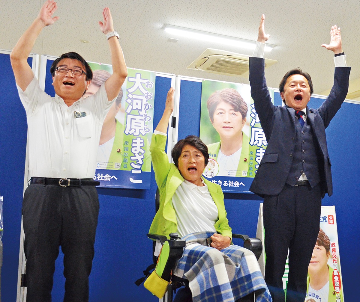 投票終了後、出口調査による一部の報道で当選確実の報も出ていたが、慎重に開票状況を見守った大河原陣営。日付が変わった午前0時過ぎに当確が決定的になると、選挙事務所は歓喜の声に包まれた。大河原氏が「皆様にいただいた3期目。さらにガツガツと活動し、共に生きる社会を必ず実現します」とあいさつすると、集まった支持者らから盛大な拍手と歓声が沸き起こった。