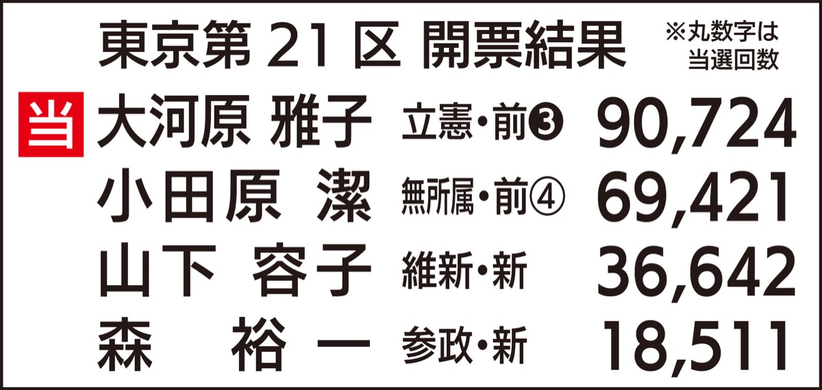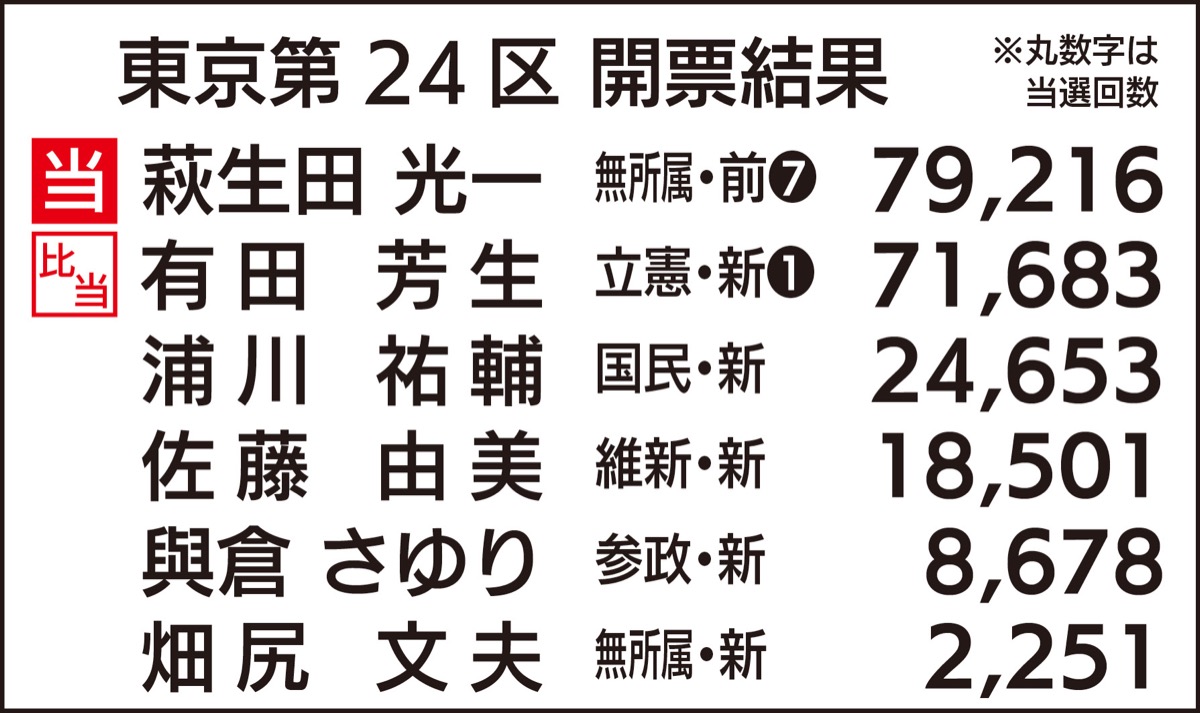第50回衆議院議員総選挙が10月27日に投開票され、6人の候補者で争われた小選挙区東京第24区は、自民党の公認を得られず無所属で立候補した前職の萩生田光一氏(61)が接戦を制し、7度目の当選を果たした。次点で敗れた立憲民主党の有田芳生氏(72)は重複立候補した比例東京ブロックで復活当選。また4人が立候補した第21区は、立憲民主党で前職の大河原雅子氏(71)が当選した。