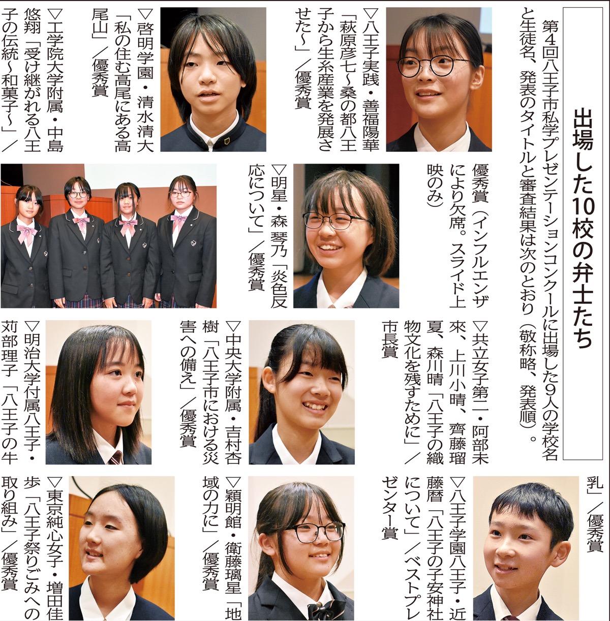 この取り組みは私学の認知度向上などを目的に、各校の広報担当者らが集い2021年にスタートさせた。「探求学習」の一環として、各自で八王子に関するテーマを設定し、自ら調査・研究。結果や提案などを人前で発表する。今年の参加中学校は八王子実践(台町)、啓明学園(昭島市)、工学院大学附属(中野町)、明星(府中市)、共立女子第二(元八王子町)、中央大学附属(小金井市)、明治大学付属八王子(戸吹町)、八王子学園八王子(台町)、穎明館(館町)、東京純心女子(滝山町)、の10校。
