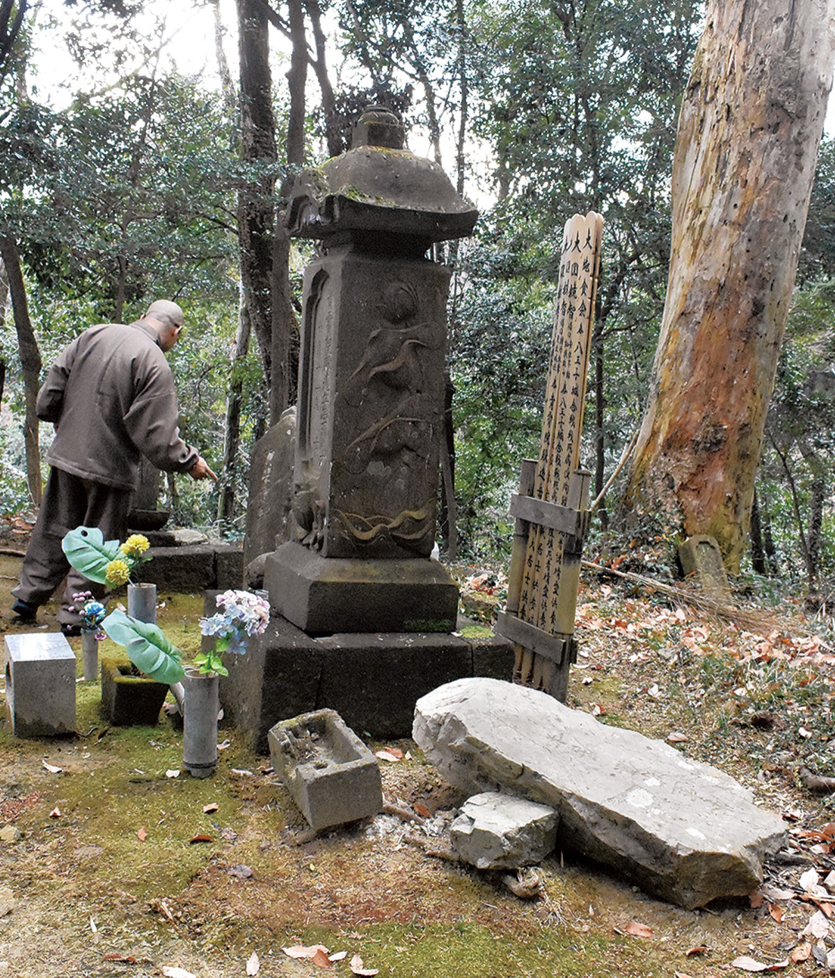 破損がわかったのは2024年6月12日早朝。供養塔の上部が折れて転がり落ちており、家範の墓石である自然石がぱったりと地面に倒れているのを里山管理に訪れた男性が発見し、すぐさま宗関寺の足利崇昭住職へ知らせた。