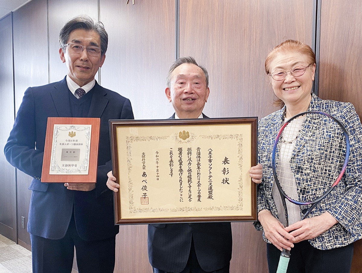 12月25日に市役所を訪れたのは、久保田会長、竹内惠子理事長、八王子市スポーツ協会の副会長で、同ソフトテニス連盟にも所属する鈴木紀幸さんの3人。受賞を報告すると、初宿市長は「長年の活動が認められて大変喜ばしい。今後も、市民の健康増進やスポーツ振興に貢献していただきたい」と激励。久保田会長は「(申請した)初年度に受賞が決まり驚嘆した」と一報を知ったときのことを振り返った。