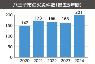 八王子消防署によると、2024年に市内で発生した火災の件数は201件(前年は163件)で、13年の226件以降の11年間で過去最多となった。同署では火の取り扱いやテーブルタップ等の許容電流を超えた電気機器の使用(いわゆる、たこ足配線)などに注意を呼びかけている。