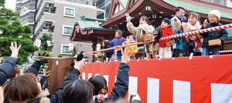豆まきには裃姿の年男・年女をはじめ、八王子芸者や萩生田光一代議士らも参加。子どもたちによる豆まきも行われ、特設ステージの上から「鬼は外、福は内」と元気いっぱいにお菓子や福豆をまくと、来場者が手や袋を差し出して「こっちにも投げて」などと歓声を上げた。