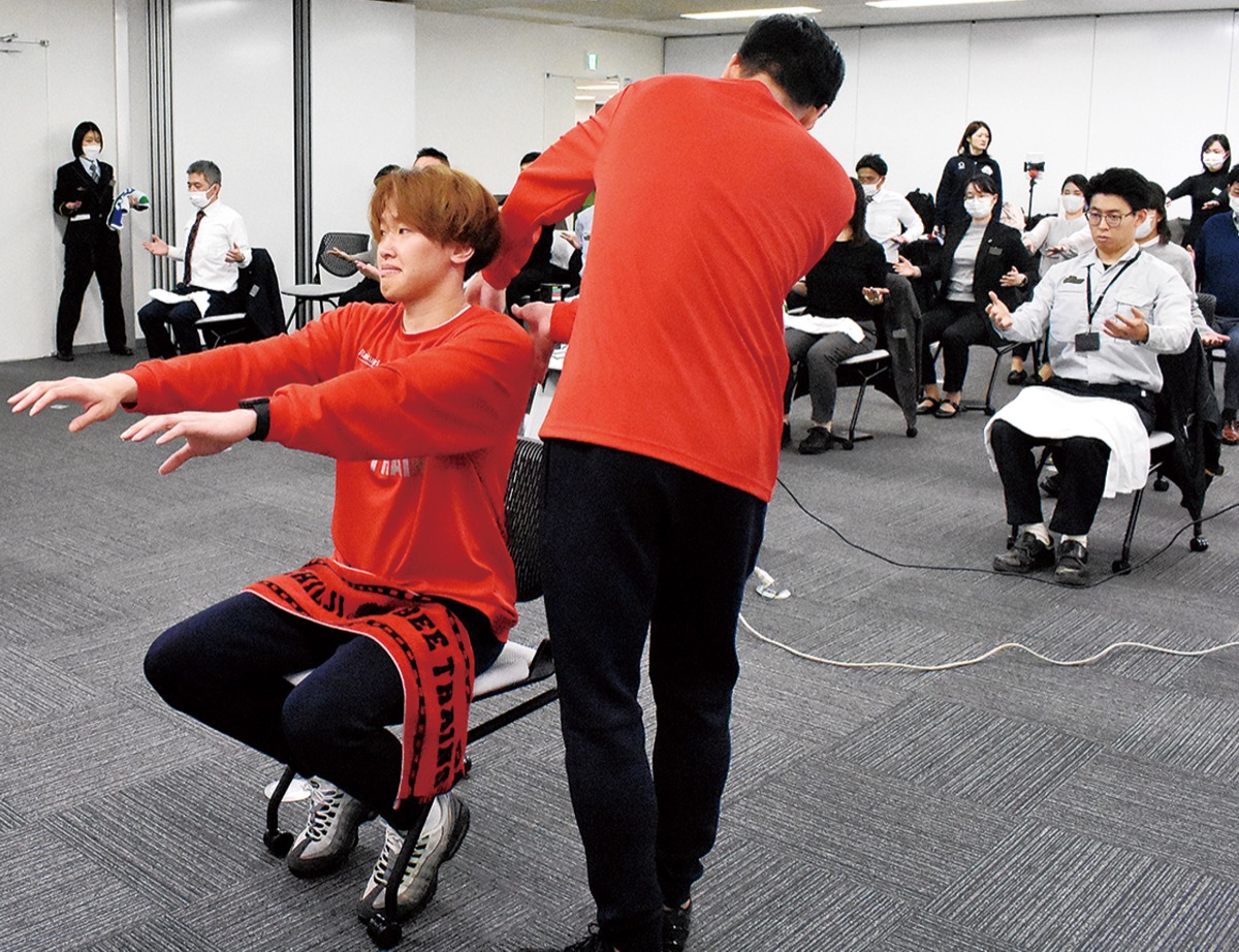 この企画は同社が取り組む健康経営促進の一環として、ビートレインズに依頼し初めて行われた。当日は会議室に約40人が集まったほか、オンラインで社内配信も行われ多くの人が参加。椅子に座りながら両肘を合わせたり足を伸ばしたり、スポーツタオルを利用して肩甲骨を動かしたりして、身体の各部位を伸ばした。
