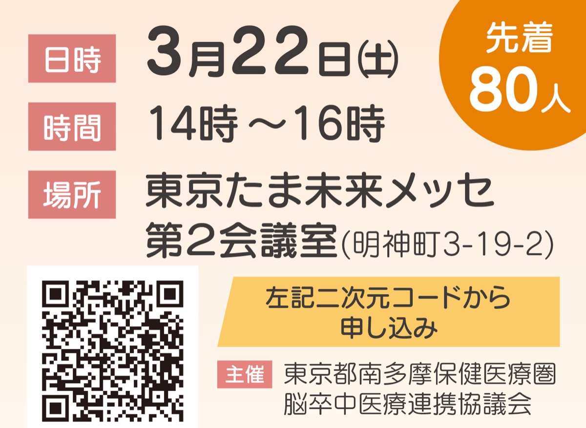 日本人の死因上位に入る「脳卒中」の最新情報が学べる市民公開講座が3月22日(土)、東京たま未来メッセで行われる。参加無料。