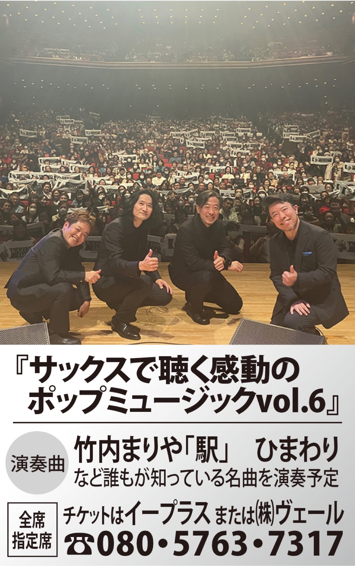 サックス奏者・尾崎一宏さんの凱旋コンサートが昨年12月にJ:COMホール八王子で開かれ、1200人超の来場者で大盛況を博した=写真。会場の募金とコンサート収益の一部の計50万2667円を能登半島地震の被災地へ送っている。