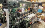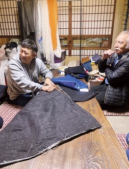 3月5日、高月町の澤井織物工場で顔を合わせた青木崇浩代表(あやめ会)と澤井伸代表(澤井織物)は試作のデニム生地を見比べながら意見を出し合った。
