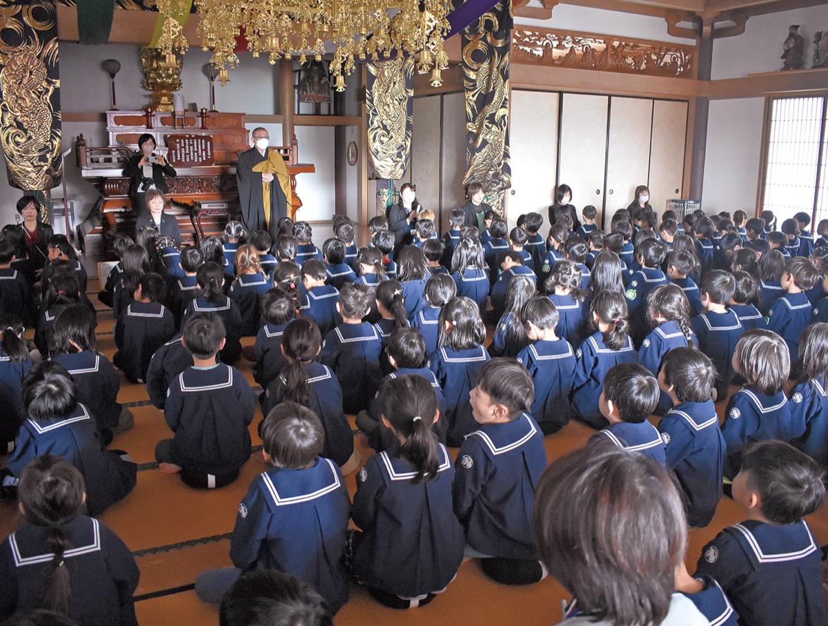 雲龍寺の足利正尊住職は「来月から小学生ですね。坐禅を知らないお友達もいると思うので、その子に心を落ち着けることができる坐禅をぜひ教えてあげて」と児童らに語りかけた。続いて同法人の足利正哲理事長は、世界から戦争をなくすために必要なことを児童らに問いかけ、「暴力を使わない」「やり返さない」「嘘はつかない」を卒業約束とし唱和させた。