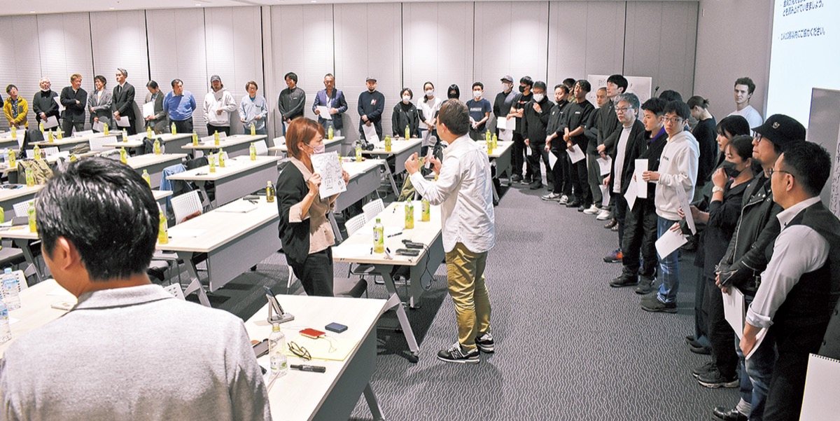 全国の駅周辺の再開発やにぎわい創りの事例を学んだ後、地域を盛り上げる3人がパネルディスカッションを行った。登壇したのは肌着専門店イツミヤ代表でご当地YouTuberの中野智行さんと、若者の雇用創出に取り組む会社めだかやドットコム代表の青木崇浩さん、音楽フェスHACHIDORI実行委員長を務める奥泰正さん。進行の永澤明彦さんからの「八王子の弱みは?」「アイデアの源泉は?」などの質問にそれぞれ答えた。3人の軽妙なやりとりに会場は笑いに包まれる場面もあった。その後は参加者が5・6人のグループに分かれ、感想や自分の考えを述べあい、「八王子がもっとよくなるアイデア」を全員で輪になり発表した=下写真。