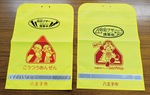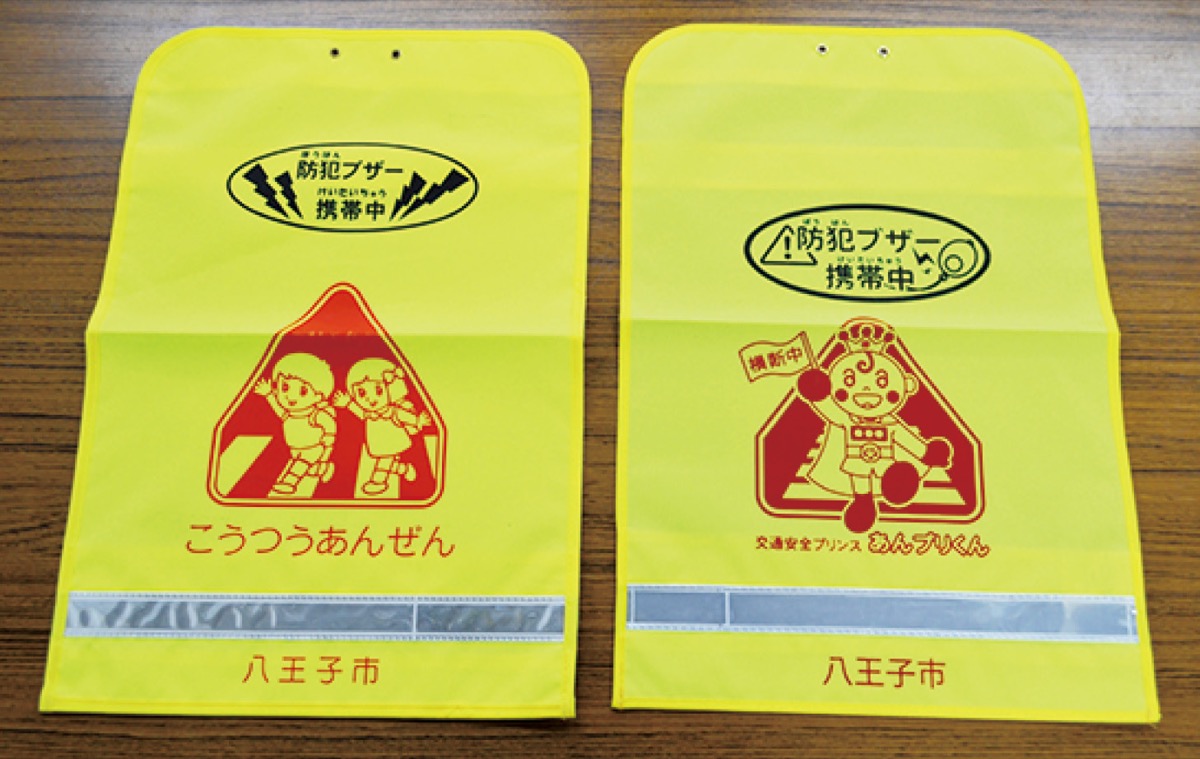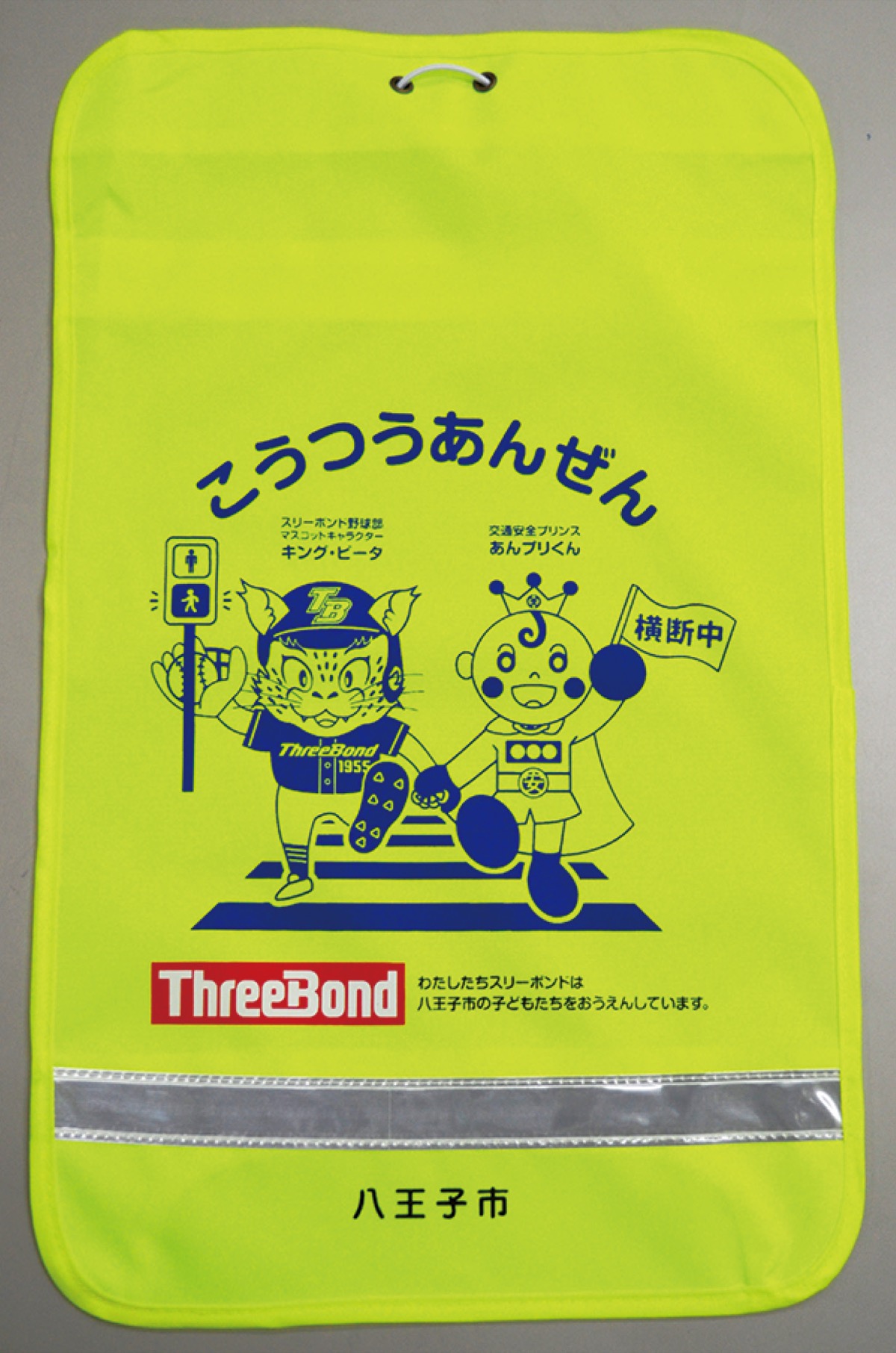 蛍光イエローの生地と反射材の帯はドライバーからも視認されやすく、カバーの中央には市の交通安全推進キャラクター「あんプリくん」とスリーボンド野球部のマスコットキャラクター「キング・ビータ」が仲良く手を挙げて横断歩道を渡っているイラストが描かれている。