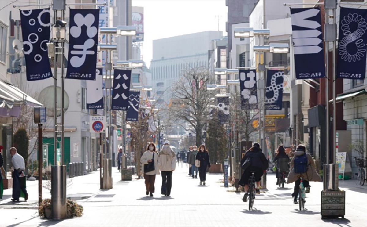 「そめる」プロジェクトは、2022年に八王子市の中心市街地に「桑都テラス」と「東京たま未来メッセ」がオープンしたことを機に、来街者へのおもてなしと回遊性の向上を目的に実施したもの。22年9月から1年間、東西の新たな施設を結ぶ道路上に歓迎フラッグや案内サインを設置して街を彩った。