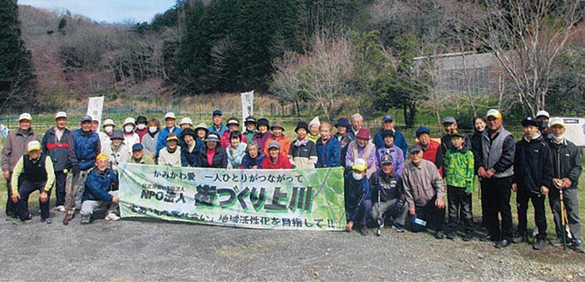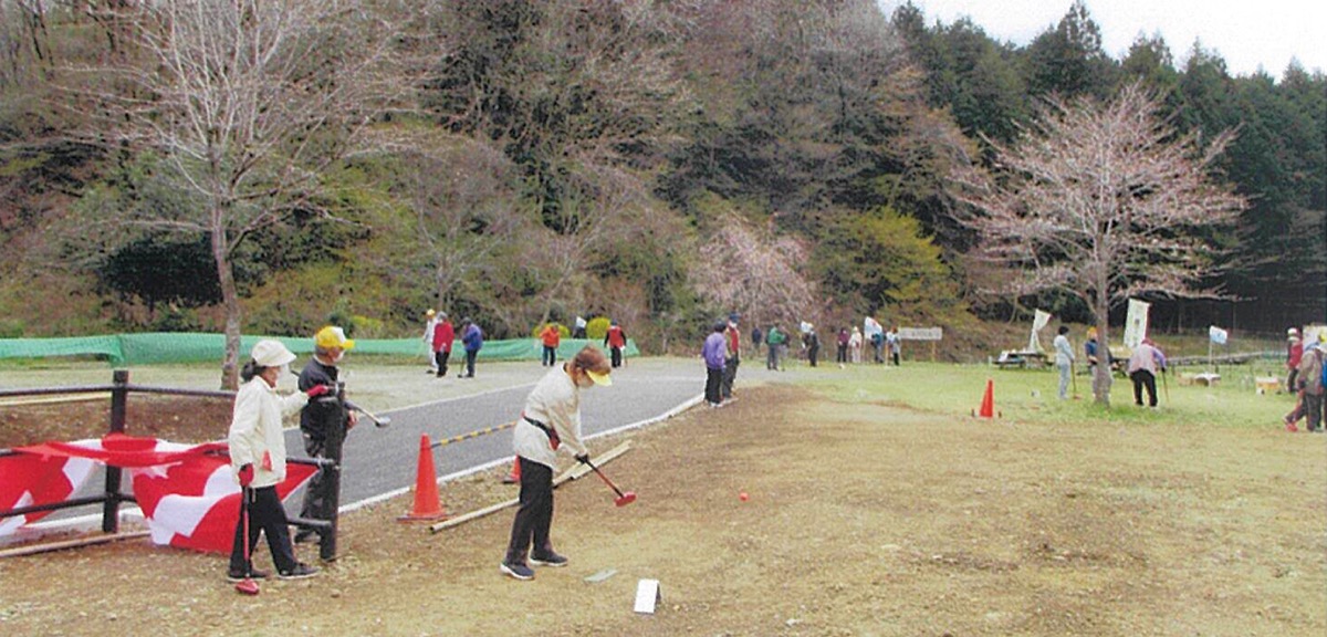 上川の里特別緑地保全地区広場の特設コースで3月31日、NPO法人街づくり上川(高野誠三理事長)主催の「第4回上川いきいきグラウンドゴルフ大会」が開かれ、39人がプレーを楽しんだ=上写真。