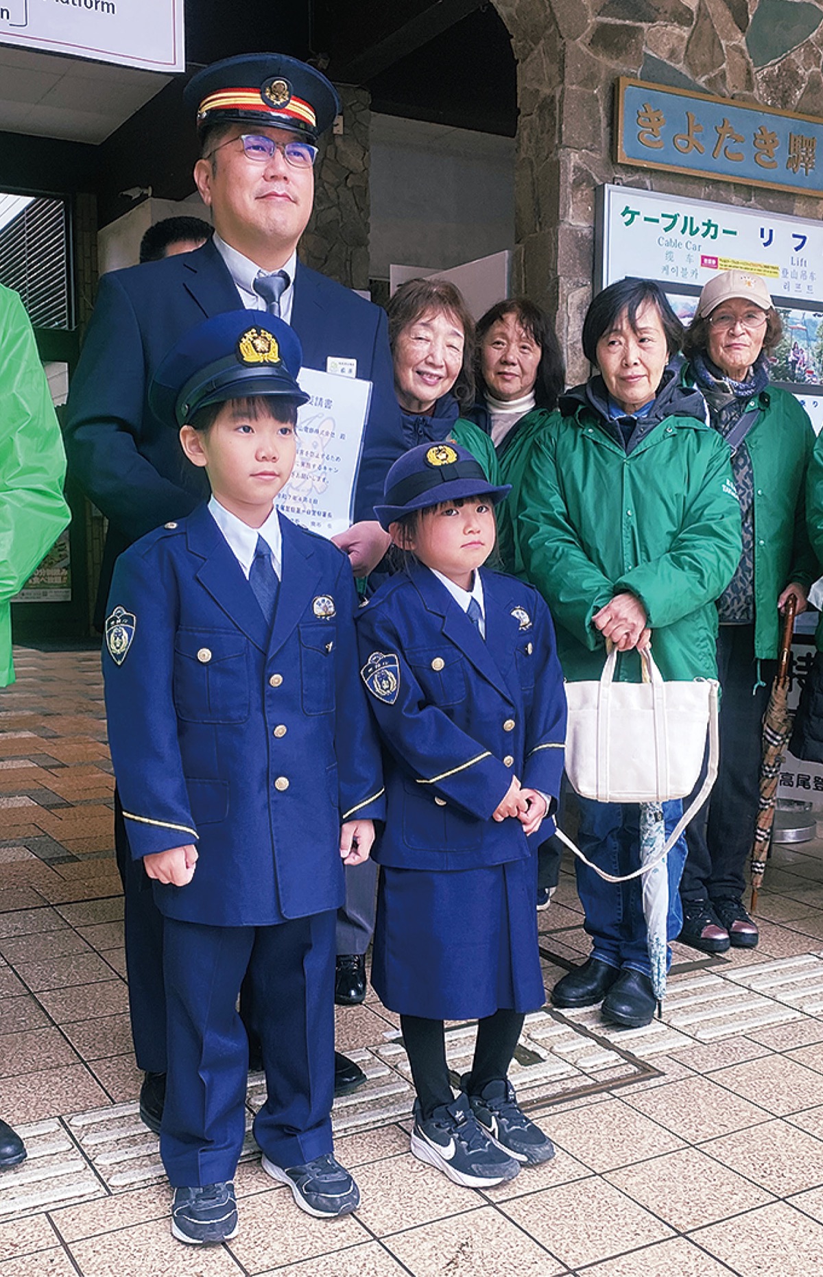 市内の小学校に通う2人が4月1日、高尾警察署の一日警察署長となりケーブルカー清滝駅で特殊詐欺被害防止活動を行った。