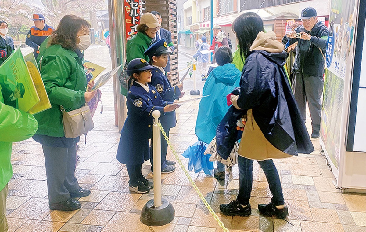 一日署長に就任したのは、城山小学校の太田悠臣さん(8)と緑が丘小学校の南谷奏さん(7)。2人は最低気温3・9度の冷たい雨の中、同駅を利用する登山客や観光客に対し「特殊詐欺に気をつけて」と一生懸命声をかけ、啓発チラシやポケットティッシュのセットを手渡していった。