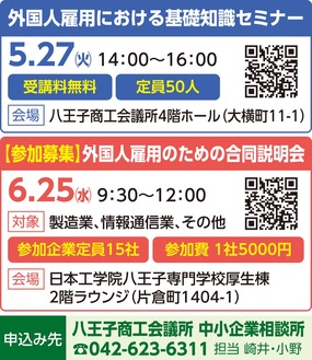 また、6月25日(水)には外国人雇用のための合同説明会が日本工学院八王子専門学校で行われる。現在、製造業・情報通信業を対象に参加企業を募集中(その他の業種は気軽に相談所へ問い合わせを)。市内の日本語学校や専門学校に通う外国人留学生の希望者が参加する説明会となる。午前9時30分から11時までの合同説明会の後、正午まで個別の相談会となる。