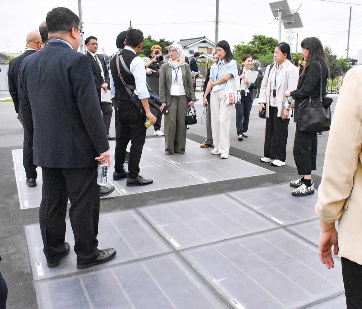 一行は敷地内の駐車場に設置された太陽光路面発電パネルの実物の上に立ったり、廃バッテリーを再製品化した街路灯などを見学。「どれくらいの発電量なのか」「スマホの充電はできるか」など具体的な質疑応答があった。議長を務めたチリ人のマリア・プリエットさんは「チリにはインフラが整わない過疎地がある。太陽光パネルの技術はすごく役に立つし、チリの人が喜びそう」と感想を話した。同社の平塚雷太常務は見学会を終え、「海外の方に直接見て頂いたのは今回が初めてだった。皆様の反応から、インフラのない地域こそ必要な技術だと実感した」と手応えを話した。