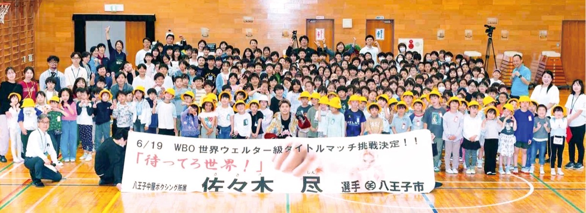 日本人初の世界ウェルター級王者に挑戦するプロボクサー・佐々木尽選手が5月19日、母校である別所小学校へサプライズ訪問した。