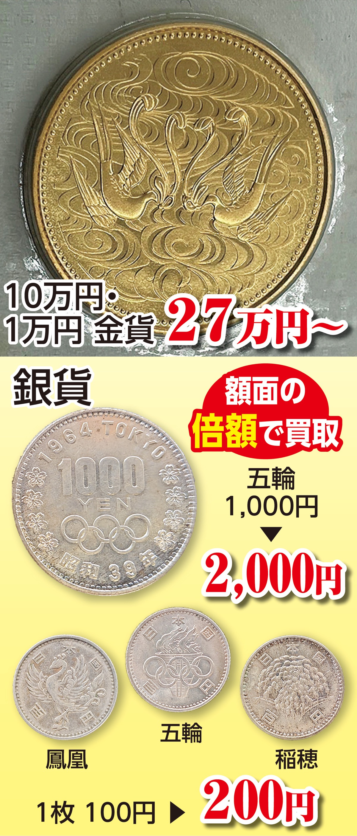 慶事や国際行事などを記念し発行された金貨や銀貨の買取りを強化中。金貨(10万円・1万円)なら27万円〜買取保証。銀貨(千円・100円)は「額面の倍」で買取。汚れていても大丈夫なので、この機会に散田へ持ち込んでみては。