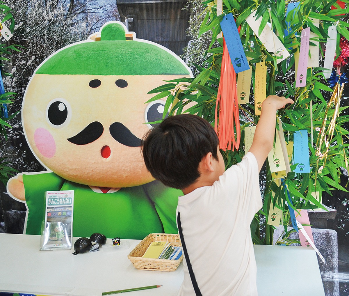 菅原道真公をモチーフにした同商店街のマスコットキャラクター「かんこうさん」の写真パネルの両脇に笹飾りが設置され、テーブルには短冊と鉛筆が用意されており、立ち寄った人が願いを書き込んで笹に吊るすことができるようになっている。通院のついでに立ち寄ったという母子の男児は、短冊に母親の身体の回復を書き込み、願いを込めて吊るしていた。七夕コーナーの設置は7月7日(月)まで。