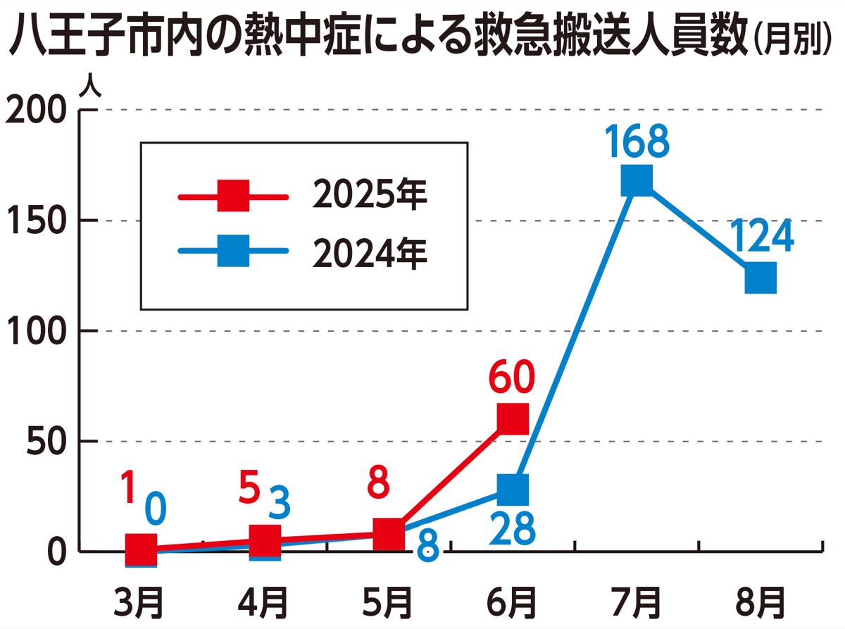 都内で日中の最高気温が30度を超える暑い日が続き、熱中症による救急車の出動が増え始めている。八王子市内でも6月に60人(29日までの速報値)が熱中症で救急搬送されており、前年同月(28人)を大きく上回るペースとなっていることから、八王子消防署では本格的な夏を迎えるこれからのシーズンに向けて注意と対策を呼びかけている。