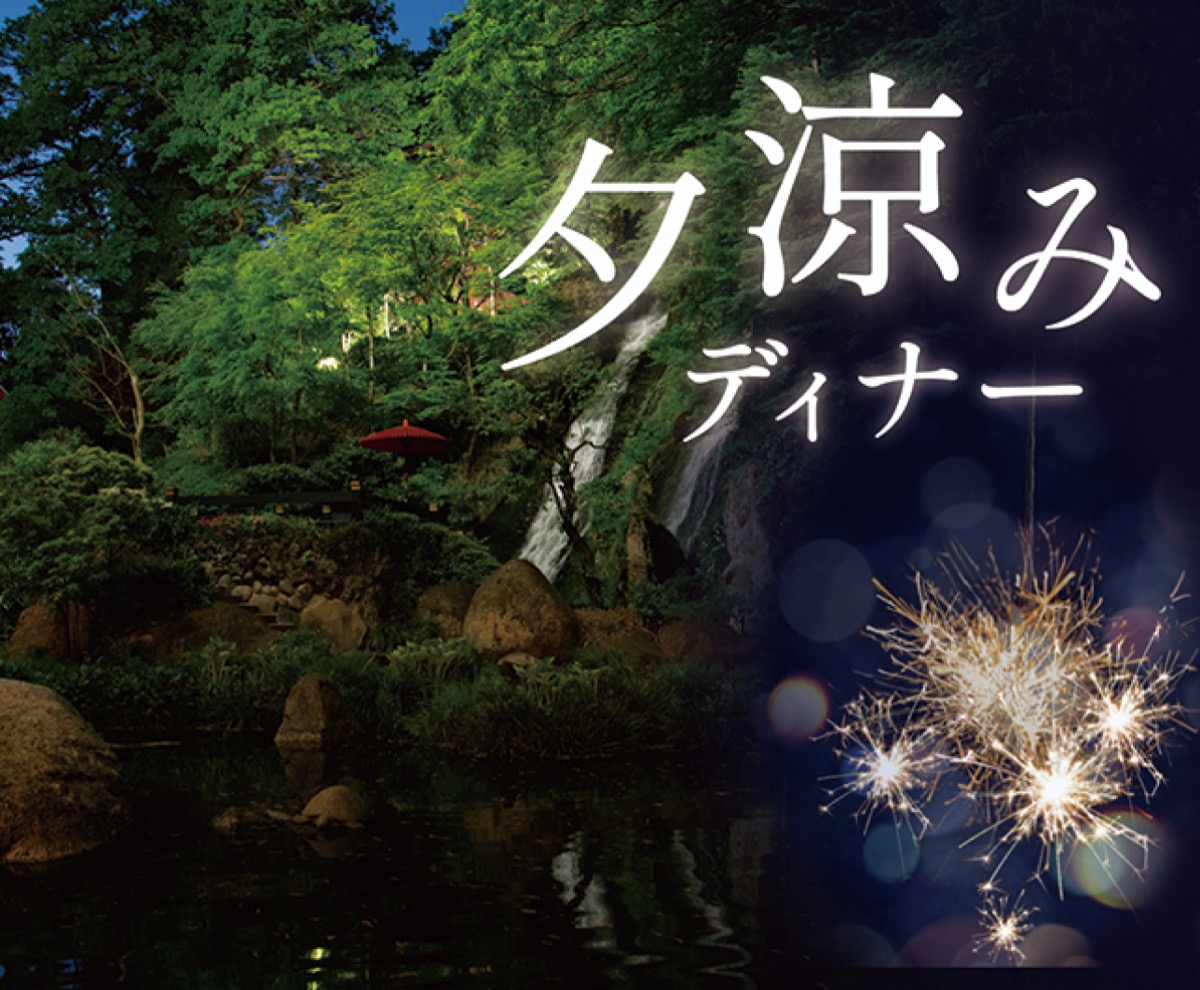 夕暮れ時の日本庭園を望む個室で涼やかな滝の清流と風鈴の音色、線香花火を愉しみながら優雅なディナーに舌鼓。