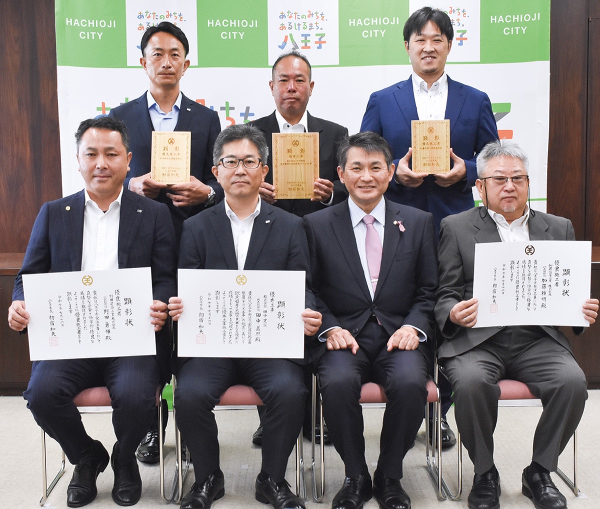 公共工事施工者の技術や公共工事の品質の向上などを目的とした八王子市優良工事施工者顕彰の対象施工者が選ばれ、顕彰状授与式が7月16日、市役所で行われた。