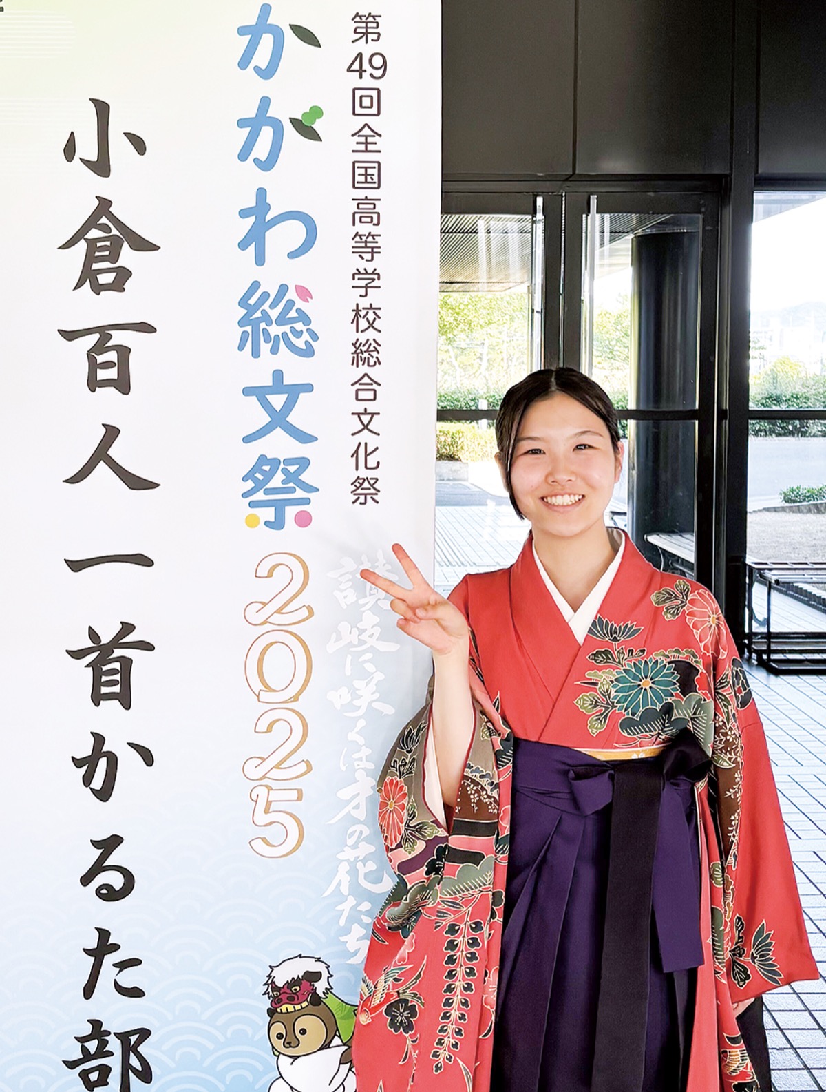 今回、「文化部のインターハイ」とも呼ばれるかがわ総文祭に出場した石飛さんは、同校かるた部に中学1年生の時から所属。取り手としても練習するなかで読み手のおもしろさに気づき、昨年夏頃から本格的に読み手の練習を開始。顧問の三塚楓己教諭の指導のもと、昨年10月にエントリーした第33回全国高等学校小倉百人一首かるた読手コンクールで上位3人に与えられる優秀読手の座を獲得したことで、かがわ総文祭への切符を手にしていた。