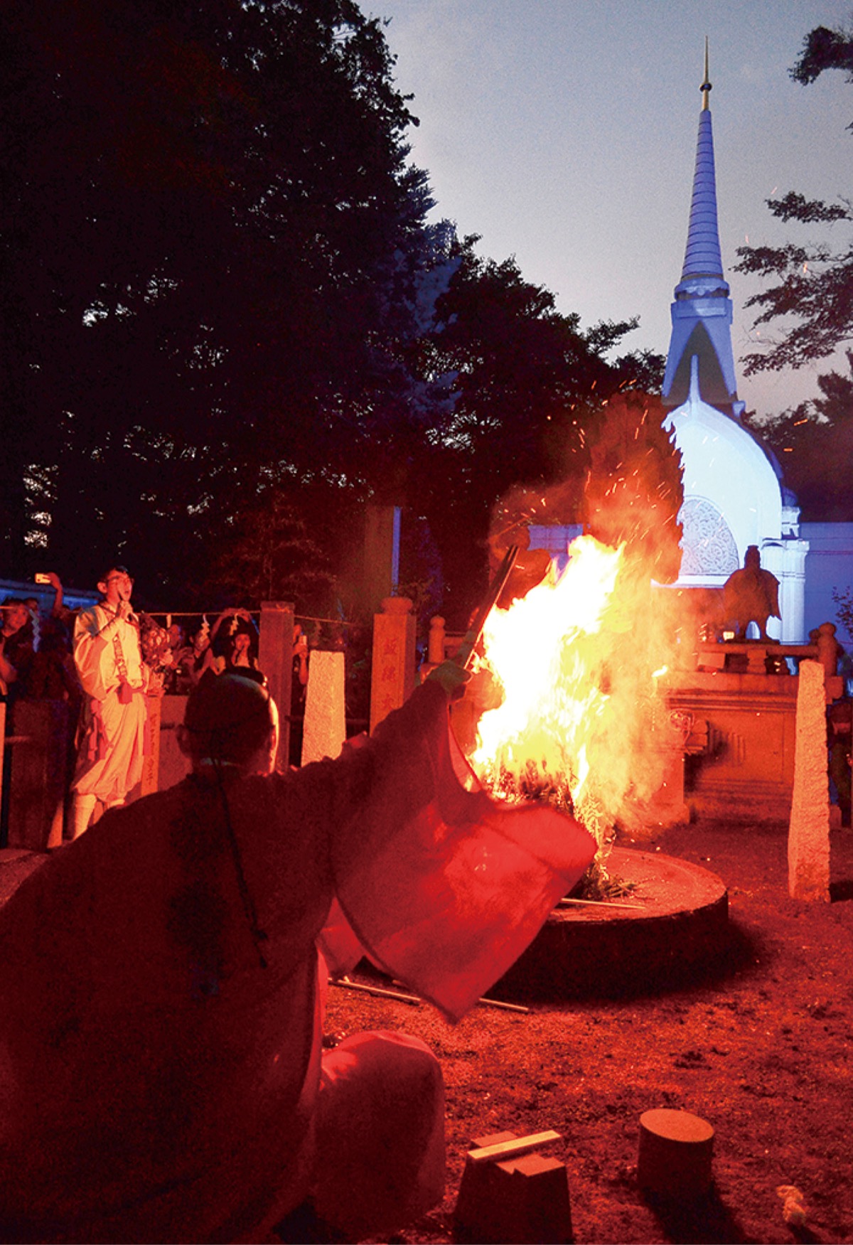 日が落ちる頃から参道沿いに並ぶ春日灯籠に灯りが点され、信徒から奉納された紙灯籠にも献灯。有喜苑広場の青く輝く仏舎利塔の前で、同山の佐藤秀仁貫首らによる柴燈護摩が執り行われた。高く燃え盛る炎の中で、被災地の復興や世界の安寧を願う読経が山々に響きわたり、集まった参拝者が静かに祈りを捧げた。