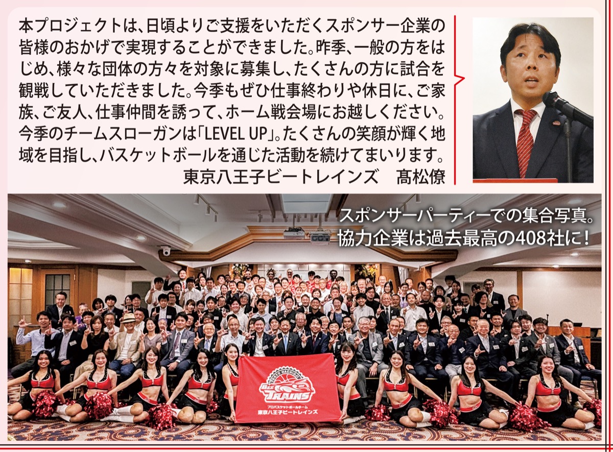 プロリーグ参入11年目を迎えるバスケットボールB3リーグ「東京八王子ビートレインズ」。八王子市内唯一のプロスポーツチームは、9月から開幕する2025-26シーズンを前に闘志を燃やす。来季から大きく革新するBリーグを前に、今季は現行の制度で行われるB3リーグ最後のシーズンとなる。クラブを運営する(株)THTマネジメントの新社長に高松僚さん=人物風土記で紹介=が就任。チームの新スローガンを『LEVEL UP』に決定し、選手・ブースター・クラブが一丸となり、リーグラストイヤーの優勝を目指し今、走り出す。