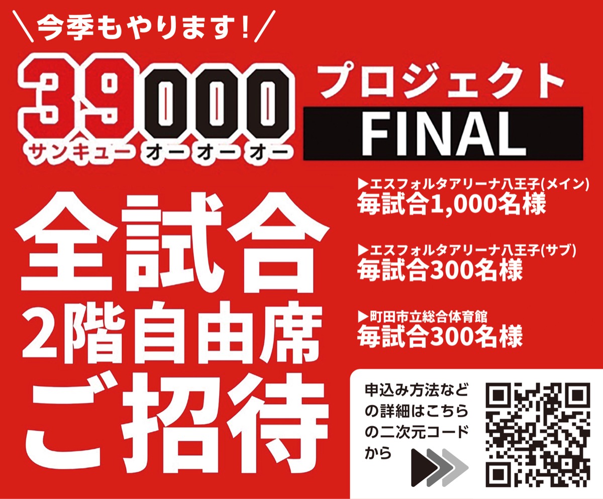 昨季、総来場者数3万9000人達成の大きな原動力となった「39000(サンキューオーオーオー)プロジェクト」を今回「FINAL」とし、再始動させる。エスフォルタアリーナ八王子(狭間町)で行われる全試合の、2階自由席を先着1000人に開放。無料で招待する=詳細は下記の二次元コードへ=。高松社長は「スポンサー様のご協力なくしてはできない。何度も見たくなるプレーと試合、会場演出を、クラブ一丸となって取り組んでいく」と決意を語った。