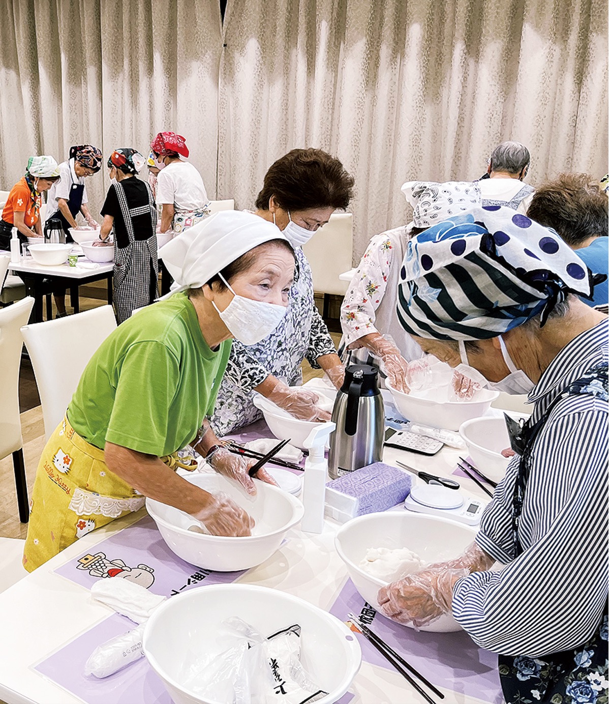 多摩地域などで葬儀式場を運営する株式会社サン・ライフは、八王子市や地域住民と連携して「まんぷくプロジェクト 枕団子づくり」を定期的に実施している。高齢者あんしん相談センター(地域包括支援センター)などから情報を聞いた年配の人など約30人が参加した枕団子づくりが9月17日、高尾町のサン・ライフファミリーホール高尾で開かれた。