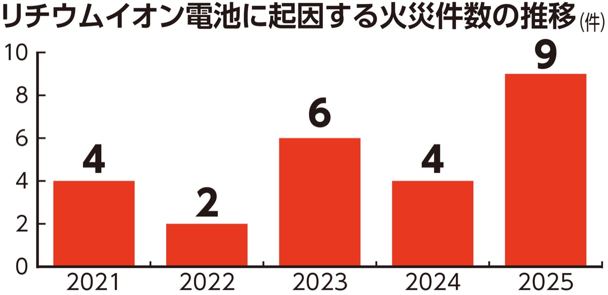 市内でも今年9件発生しており、昨年より倍増。同署は「ふくらんでいる、熱のこもりやすい場所で使用している、落としたことがある、充電できない、指定された充電器やバッテリーを使用していない、以上のようなときは危険です。使用を中止するか、使い方を改めましょう」と呼びかける。