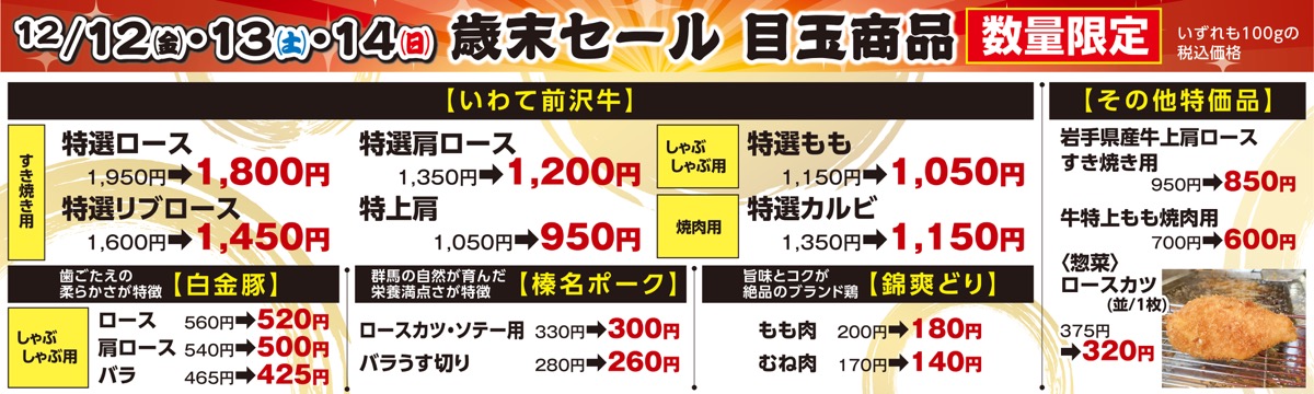 まず12月上旬に行うのは、精肉を中心に大特価で売り出す「歳末セール」だ。