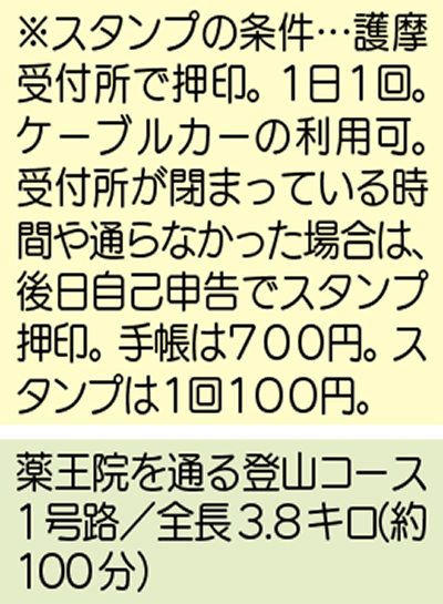 健康のための登山を後押ししようと、高尾山薬王院(八王子市高尾町)では同院の護摩受付所まで訪ねた人を対象に手帳を発行し、登山の証となるスタンプを押している。この「健康登山」は2000年頃からはじめた取り組みで、スタンプは21個押されると「満行(まんぎょう)」となり、新しい手帳に更新される。満行を繰り返し、100冊の手帳を数える登山者(成満者/2100回スタンプを押された人)が間もなく100人に達する。