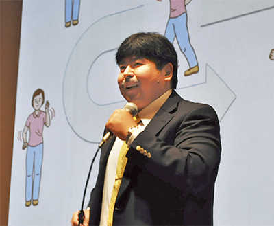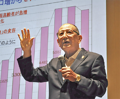講師として登壇した東京都健康長寿医療センター研究所の大渕修一氏が「健康寿命の延ばし方」をテーマに講演。老年症候群の予防として中程度の運動が必要であることから、簡単なエクササイズを来場者と一緒に実践しながら解説。「1人ではできないので、地域で取り組むことが大事」と力説した。