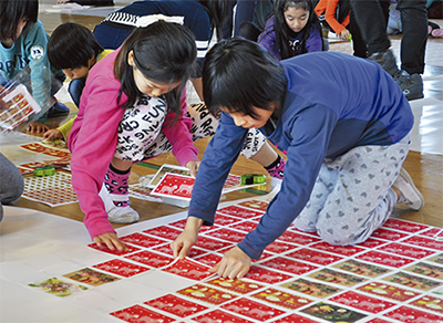 市立西愛宕小学校(岡田啓孝校長)と、年賀状等制作・印刷会社「(株)マイプリント」(本社・永山、木村健一代表取締役)は11月28日・29日、年賀状を使った巨大モザイクアートの制作に挑戦し、ギネス世界記録を達成した。使用した年賀状は4万8千4百枚。716・32平方メートル(縦32・56m×横22m)のモザイクアートが完成し、同小学校の児童たちは世界記録の認定に喜びの声を上げた。