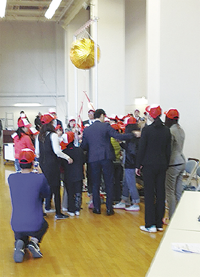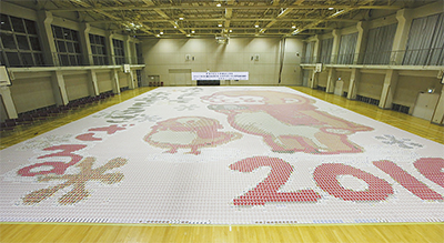 会場となったのは恵泉女学園大学の体育館。同社社員70人と、西愛宕小学校の児童、卒業生、保護者、地域の人たち95人が参加して、午前10時過ぎに制作に取り掛かった。事前に制作したデザイン画をもとに、いくつかのグループに分かれて、大きな画用紙に1枚1枚年賀状を貼付。途中で児童たちは帰宅したものの、同社社員が作業を続け午後7時過ぎに作品が完成すると、会場から大きな拍手と歓声が巻き起こった。