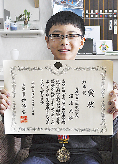 小学生自らが決めた理科の研究テーマを展示・発表する「平成27年度 東京都小学生科学展」(東京都教育委員会主催)が今年度初めて開催され、市立南鶴牧小学校6年生の湯浅大輝君が最優秀賞となる知事賞に輝いた。湯浅君の研究テーマは「自然の力による水質浄化のしくみについて」。2月9日から14日まで東京都美術館(台東区)で作品が展示され、湯浅君は13日に会場で発表を行う予定だ。