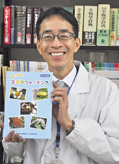 「学校周辺の豊かな自然環境を、生徒や地域の人たちに知ってほしかった」と、「生き物ウォッチング」の公開の目的を語る有岡教頭。このコーナーでは、授業の合間や休日、自然科学部のクラブ活動で、学校周辺や聖蹟桜ヶ丘、よこやまの道などを歩き、見つけた昆虫や植物などを季節に合わせて定期的に紹介してきた。2015年度版は、近隣では普段見ることができない「キジ」や、都内で絶滅危惧種に指定されている「ハグロトンボ」、特定(危険)動物に指定されている「ヤマガカシ」など、ブログで紹介したものが本に収められている。