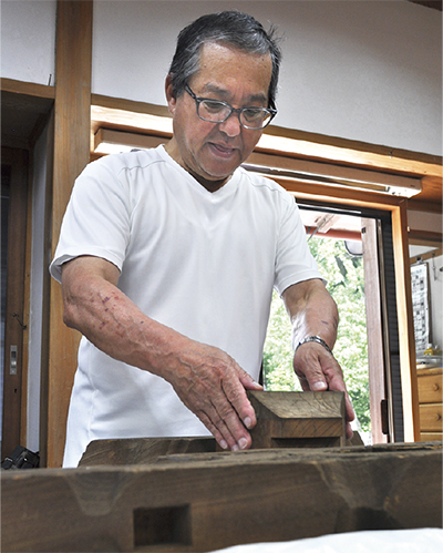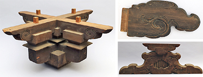 小町さんが保管していた旧拝殿の部材は、障子や欄間の骨組を方形に組む「升組」、梁や桁の上に置かれ上部構造を支える他、装飾的役割のある「蟇股」、柱の外側に突出した装飾の「木鼻」の3点。