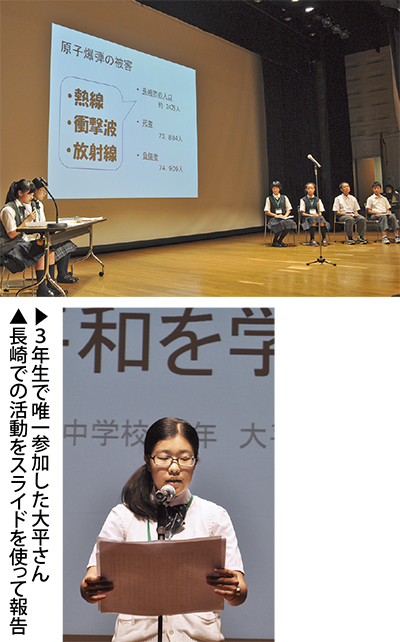 多摩市子ども被爆地派遣事業で、長崎を訪問した中学生6人による報告会が8月28日、永山公民館ベルブホールで開催され、中学生たちが核兵器廃絶、平和の大切さを訴えた。