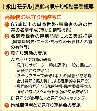 市高齢支援課では「今回は『永山モデル』として試験的に永山3・4丁目を対象に取り組みを進めていく。地域によって状況が異なるため、他のエリアで永山モデルがそのまま当てはまるとは限らないが、今後他のエリアでも同様に進めていきたい」と話している。